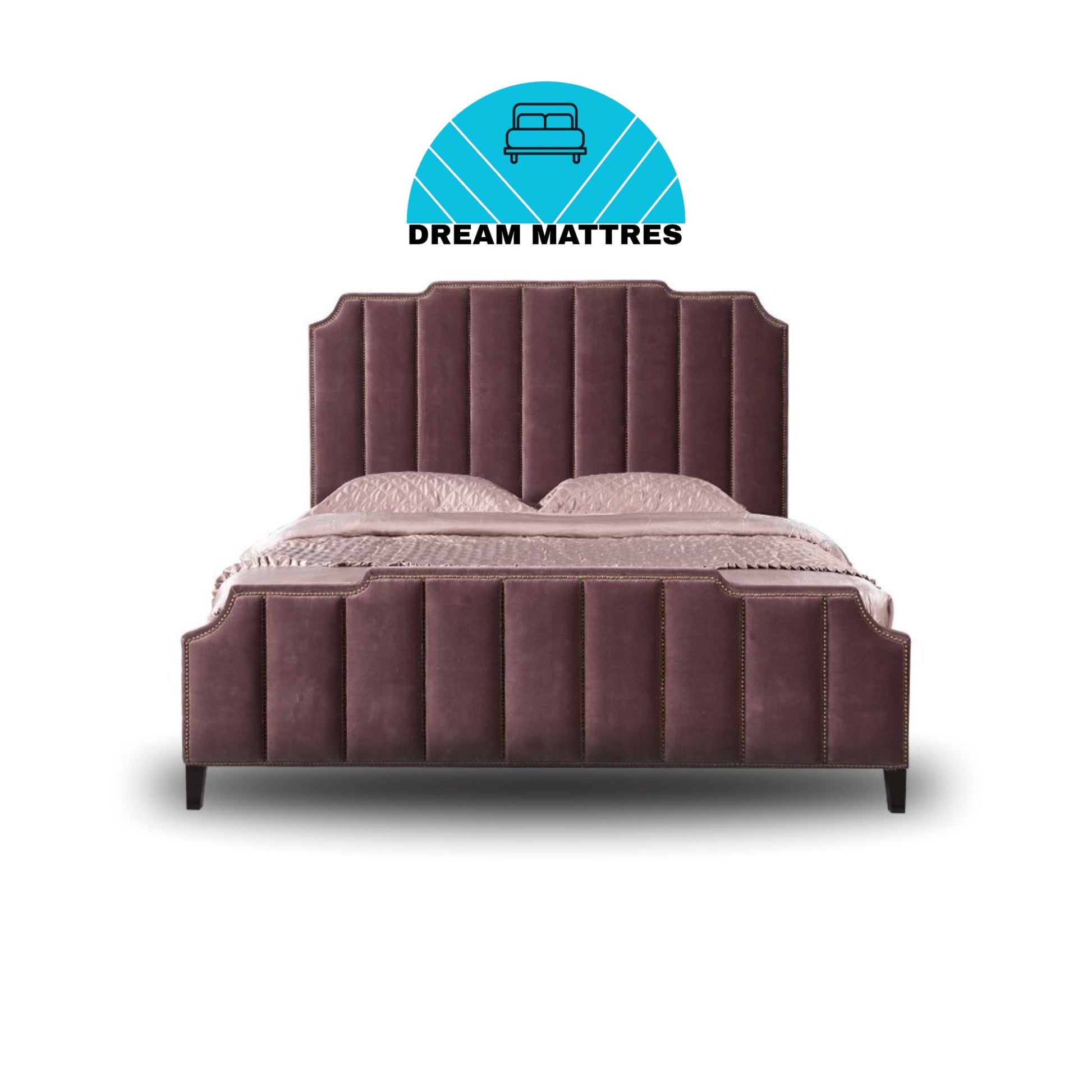 Purple Velvet Vertical Channel Tufted Bed with Stepped Headboard & Nailhead Trim
